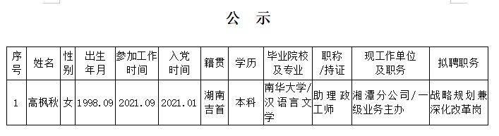 為了加強(qiáng)對(duì)干部選拔工作的監(jiān)督,提高識(shí)別和任用干部的準(zhǔn)確程度,公司按照2025年3月24日發(fā)布的《湖南建投四建集團(tuán)有限公司公開(kāi)招聘公告》的要求,開(kāi)展了公開(kāi)招聘工作。現(xiàn)根據(jù)招聘結(jié)果,經(jīng)公司研究決定對(duì)高楓秋同志擬任職務(wù)進(jìn)行任前公示。